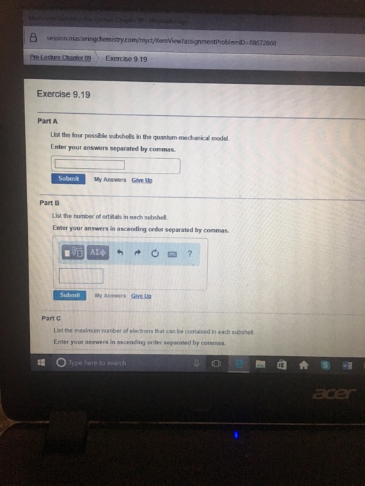 Chemistry questions and answers. 凸 commyctitemViewassignmentProblemiD-83672060 Pre-Lecture Chapter 09 Exercise 919 Exercise 919 Part A List the four possible subshells in the quantum-mechanical model Enter your answers separated by commas. View Untitled documentdocx from HUMN 1933 at Tulsa Community College.